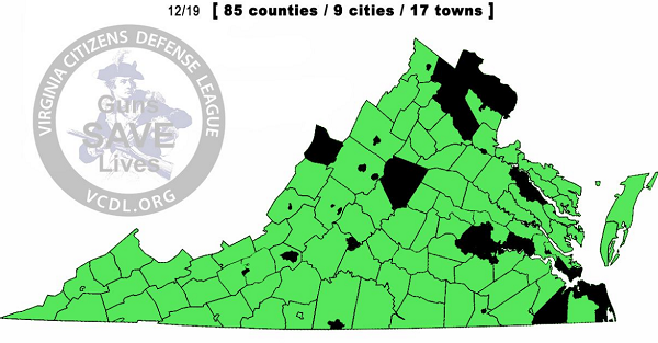 In Virginia, a reported 90+ counties and municipalities have declared pro-2A sanctuary status. As of 12/19, the tally was 85 counties, 9 cities and 17 towns. The pro-2A map of Virginia looks like this (where green means pro-2A): (source: VCDL.org)