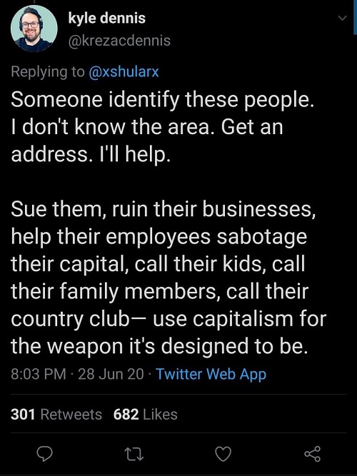 By the way, in examining the outrageous left-wing hatred against people who defend their own homes, take a look at Kyle Dennis (@krezacdennis) — a self-described “anti-racism executive coach” — who begged for more members of the lunatic mob to attack and destroy this couple: