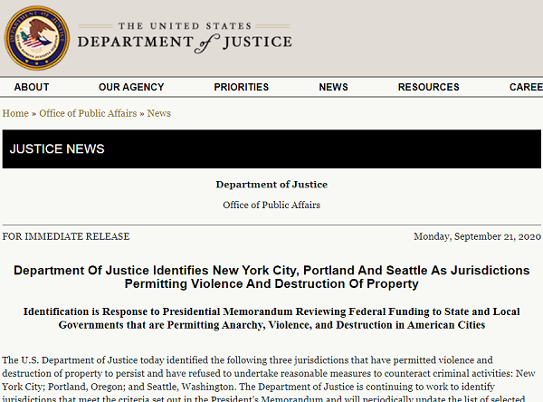 The U.S. Department of Justice today identified the following three jurisdictions that have permitted violence and destruction of property to persist and have refused to undertake reasonable measures to counteract criminal activities: New York City; Portland, Oregon; and Seattle, Washington.
