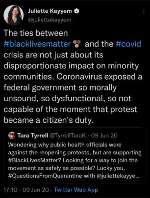 In another tweet a few days later, she wrote: “The ties between #blacklivesmatter and the #covid crisis are not just about its disproportionate impact on minority communities. Coronavirus exposed a federal government so morally unsound, so dysfunctional, so not capable of the moment that protest became a citizen’s duty.”